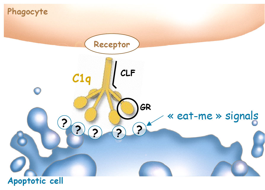 C1q is a hexamer of heterotrimers which consists of two typical regions, a collagenous-like fragment (CLF) from which emerge six globular regions (GR). It has been indirectly demonstrated that GR are involved in the specific recognition of apoptotic cells. On the other hand, CLF are involved in C1q recognition at the surface of phagocytes (2). When I started my PhD, the phagocytic receptors for C1q had already been described, however, none of the ligands for C1q on the surface of apoptotic cells was known. Therefore, during my PhD Iset out to identify and characterize ligands exposed on dying cell surface during apoptosis, responsible for GR binding and thus for specific recognition of apoptotic cells by C1q. |