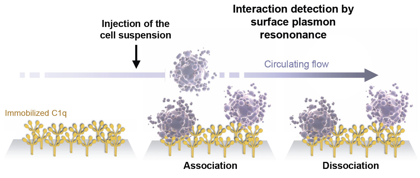 For this study, I first developed a cell-based BIAcore assay that allows to monitor interaction between C1q and cell surface, in real-time and without preliminary labeling (3). This assay allowed us to demonstrate that GR can bind to cell membrane rapidly after induction of apoptosis. By utilizing this assay, we showed that C1q GR specifically recognize different molecules on the surface of apoptotic cells. |