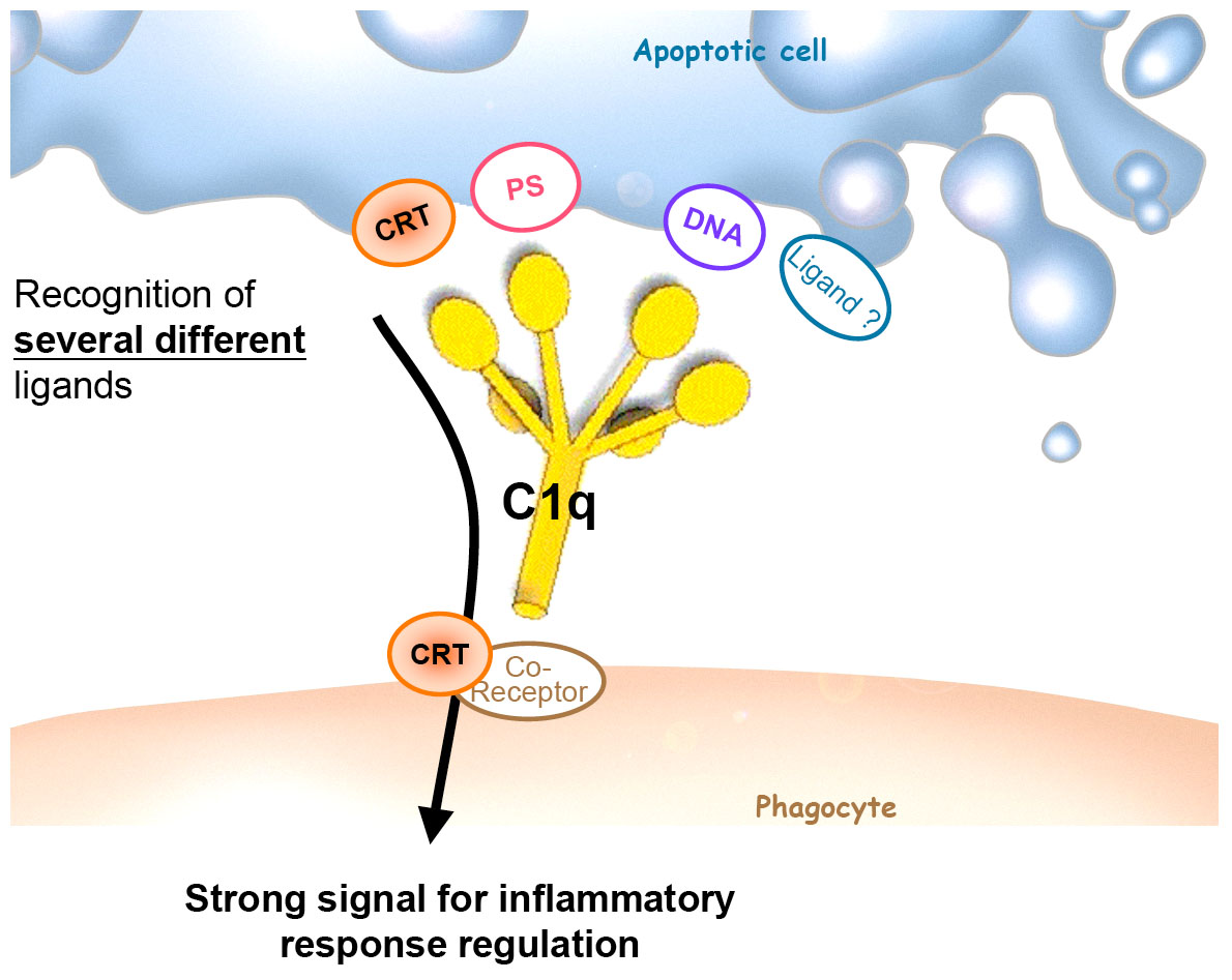 In conclusion, during my PhD, I identified at least two novel ligands for C1q on apoptotic cell surface, phosphatidylserine and DNA, and defined CRT as a very promising C1q ligand. Thus, due to its heterotrimeric and multivalent characteristics, one C1q molecule has the unique ability to collect several different recognition signal which, altogether provides a very strong recognition signal. Given its decisive role in the control of inflammation, these recognition properties might be of major importance in the regulation of the immune response. Eventually, this study could allow not only to precise the mechanisms implicated in inflammatory diseases progression, but also to consider the development of new therapeutic for autoimmune pathologies such as lupus. |