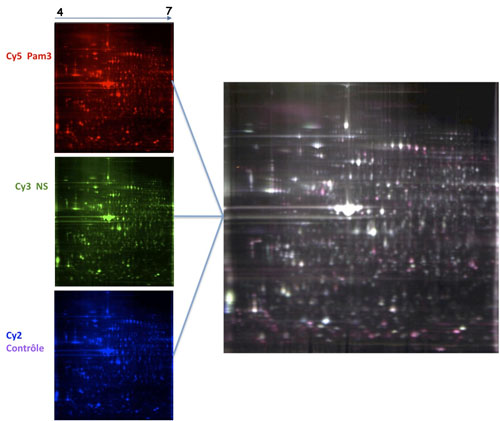 Figure 1: Image of one gel selected from the 12 gels realized for 2D-DIGE analysis. This gel contains lipid rafts proteins of THP1 cells before (Cy3, green) and following 5- min stimulation of TLR2 with Pam3 (Cy5, red). Cy2 is an internal standard and corresponds to 1:1 ratio of unlabeled proteins from both groups. Gels were analysed by Decyder software, statistics were generated for upregulated and downregulated proteins such as IMPDHII. | ![]() |