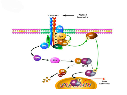Figure 2. Lyn controls the PI 3-kinase pathway through phosphorylation of its p110 subunit after TLR2 engagement. The presence of bacteria- derived acylated lipoproteins results in the heterodimerization of TLR1/6 in membrane microdomains. MyD88/IRAK are recruited to the receptor and lead to degradation of I-κB and translocation of NF-κB subunits. A Rac/PI3‐kinase‐ dependent signaling pathway has also been described. After tyrosine phosphorylation of the cytoplasmic domain of TLR2, the p85 α subunit of PI3-kinase is recruited to the receptor and phosphorylated on tyrosine. A Lyn-dependent tyrosine phosphorylation is required to activate p110. PI3‐K therefore recruits AKT to the inner membrane, precluding a cascade that results in transactivation of the p65 subunit of NF‐ κ B. This leads to the nuclear translocation of p50/p65 NF-κB heterodimer and to expression of cytokines. |
