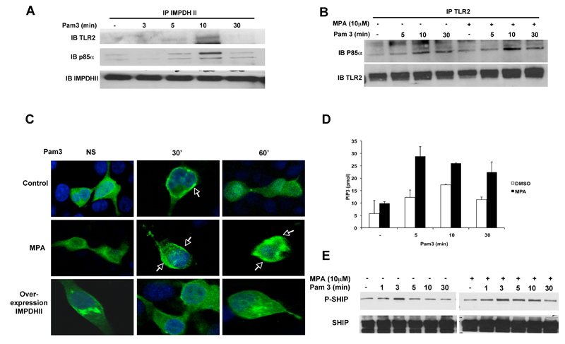Figure 3. IMPDHII modulates PI3-K activation upstream of Akt. Activation of PI-3Kinase leads to the formation of PIP3. To investigate the role of IMPDHII on PI-3K activity, we transfected HEK293- T2 cells with a construct encoding a fusion protein between the PH domain of Akt and GFP, and studied translocation of Akt to the plasma membrane after stimulation with Pam3 with Confocal microscopy. In control conditions, Pam3 induced a transient translocation of the fluorescent probe to the plasma membrane 30 min after stimulation. Inhibition of IMPDHII activity with MPA resulted in a sustained recruitment of Akt to PIP3 whereas overexpression of IMPDHII prevented the recruitment of Akt to the cell membrane, suggesting that IMPDHII negatively regulates PI3-K |